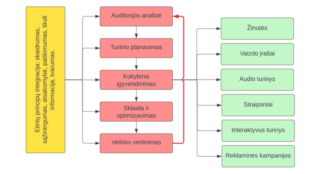 Pateiktoje diagramoje pavaizduotas turinio kūrimo proceso modelis, kuriame svarbiausias elementas – etinių principų integravimas visais sprendimų priėmimo etapais. Kairėje pusėje išskirtos pagrindinės vertybės – skaidrumas, sąžiningumas, atsakomybė, patikimumas, informacijos tikslumas ir tvarumas – kurios veikia kaip pagrindas visam turinio kūrimo ciklui.